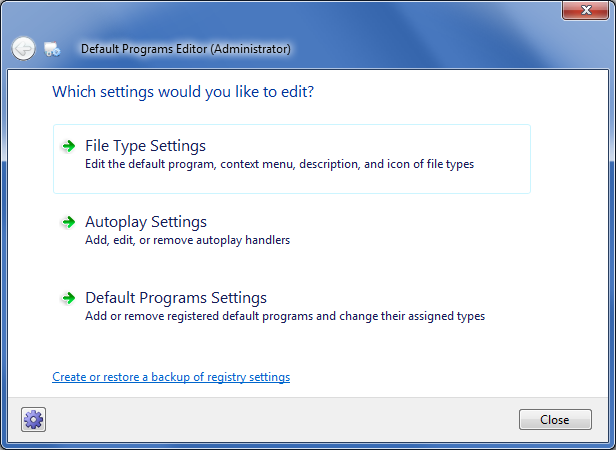 Default Programs Editor позволяет легко исправить настройки ассоциации файлов в Windows, включая элементы контекстного меню, значки и описания, а также настройки автовоспроизведения и настройки программ по умолчанию … и все это без возни с реестром. Программа портативная и не требует установки.