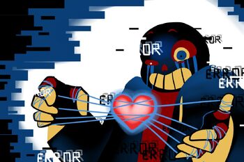 Error!Sans is an AU destroyer created by Tumblr user Lover of Piggies(also known as Crayon Queen or CQ for short) on Tumblr. In this AU, he is bent on destroying all AUs and things he considers ‘glitches’ or ‘mistakes’ in the multiverse.