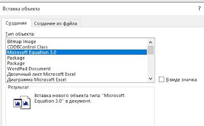 В поле Тип объекта выберите значение Microsoft Equation 3.0.